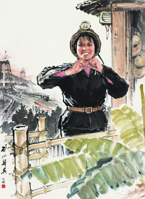 画家塑造了一位年轻的女煤矿工整理服装准备下井投入工作的形象,表现了女矿工爱生活、爱工作健康向上的精神面貌。他把这个矿山新兵放置在一株芭蕉边上,喇叭和大字报,都组成了当时的真实环境,具有代表性。画面里细节颇丰,无不显示着画家的良苦用心,比如在矿工服的袖口和领口露出里面鲜艳的衣服,墙上还有斗笠帽子,揭示了她从农民跨入了工人阶级队伍的角色转变。画家运用写意人物画的表现方式,吸收了西方绘画中对光与影的表现,增强了所作人物画的体积感,形成自己独特的绘画风格。