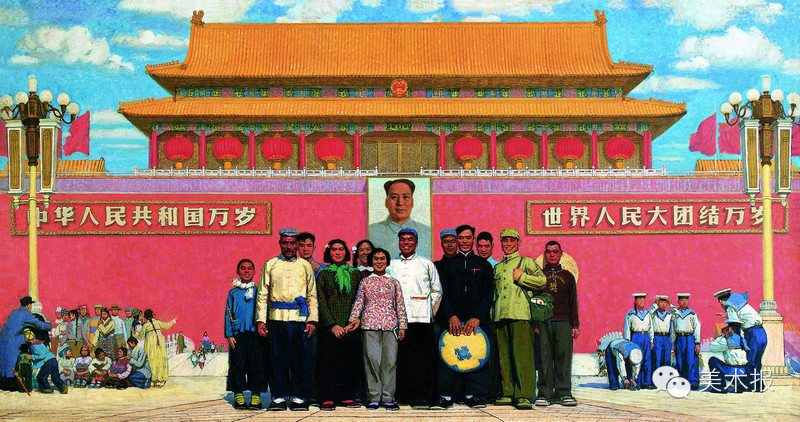 这幅作品是为了向建国15周年献礼,画家的画笔代替了天安门前摄影师按动快门的手指,记录下人物的欣喜与幸福。画面分为三个层次,近景的人物安排了12位农民,中景则是右边的海军战士和左边的少数民族,远景的金水桥点缀着孩子们和红领巾。画面色调以天安门城墙和屋顶的红黄色为主,取对称性的构图,描绘出恢宏喜庆的气氛。作品吸收了新年画的表现方法和审美特点,运用了散点透视法,有意减弱了自然光的明暗关系,但依旧积极表现物象体积和质感,是追求油画民族化的探索过程中的优秀作品。