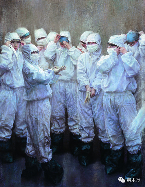 这幅作品的创作背景是“非典时期”,医护人员正在穿防护服、戴手套,画家对粉画语言的把握入色三分,笔下的人物一个个神情专注,沉着冷静。白衣天使们并肩作战,占据了整个画幅的宽度,恰似为人民筑起的白色屏障,无私无畏,坚毅圣洁。这种新写实主义画风既有现实主义写实的功力,又有开放以来的浪漫传神的想象力,抓住了西画富表现力与中国画写意造境的传神之美,具有独创性。