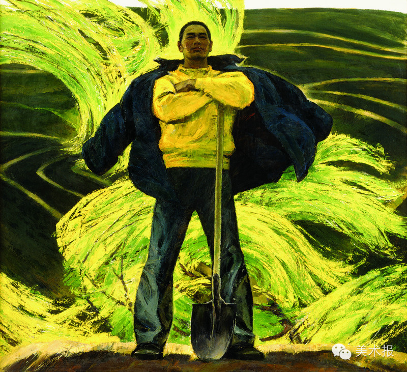这是一幅表现当代中国农村改革的作品,被誉为“上世纪80年代中国改革开放的缩影”。画家以夸张的写意手法塑造了一位青年农民的形象,顶天立地,交叉双臂,扶着铁锹,好像准备脱掉身披的棉袄投入实干。大写意的笔触挥洒出风中自由摇摆的杨柳,墨绿色沃土上涌动绿潮,也象征着新时期新农民建设新农村的澎湃心潮,黄、绿、黑三色错综回旋的交响合成了一曲气势恢宏的乐章。