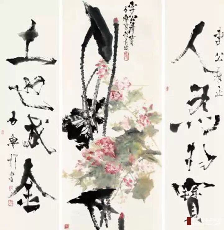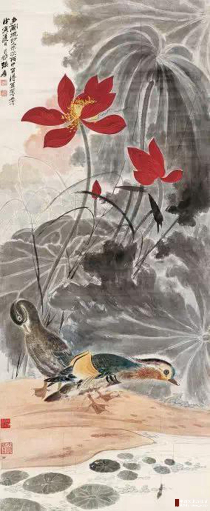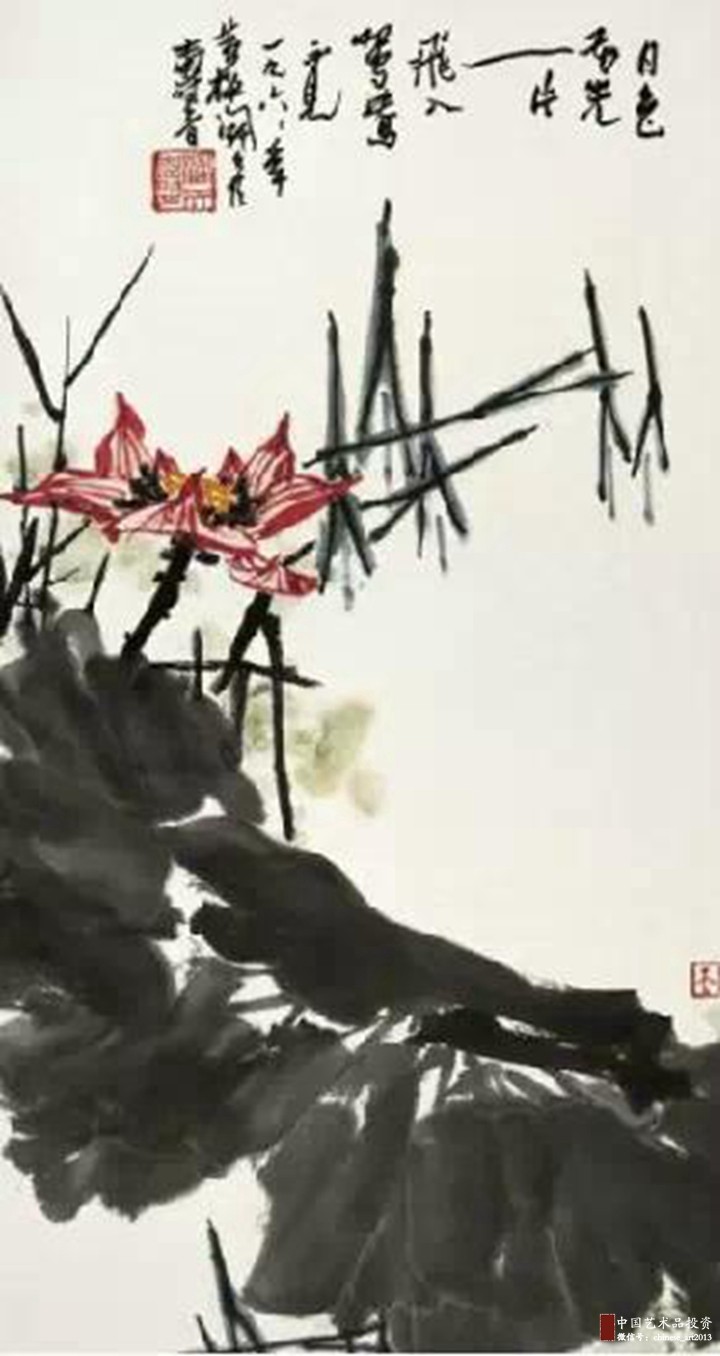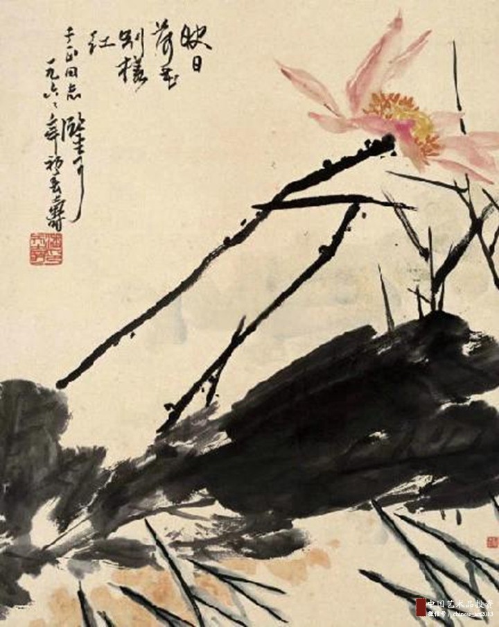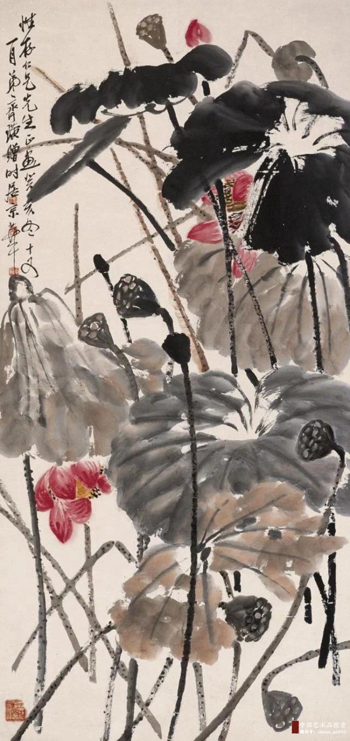 潘天寿的荷花笔墨苍古、凝炼老辣,且大气磅礴,雄浑奇掘,具有摄人心魄的力量感和现代结构美。