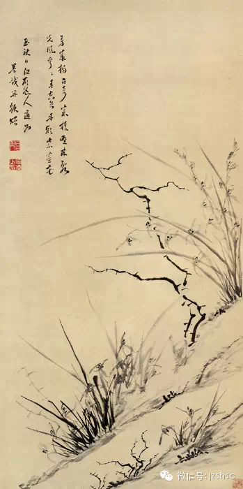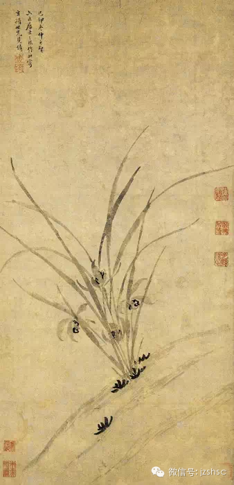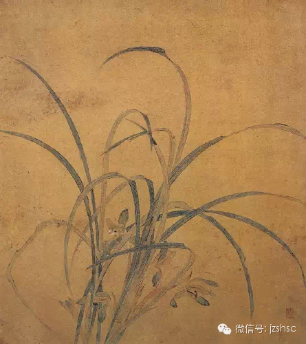 图即兼融设色没骨和水墨写意两法,属于水墨浅设色写意花卉画一类。兰花以淡墨写出,与花、叶相穿插,似乱而有序,笔墨更具书法之韵。笔、墨、色、形相辅相成,浑然一体,俊逸而清丽,风格独具。