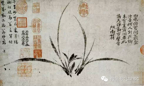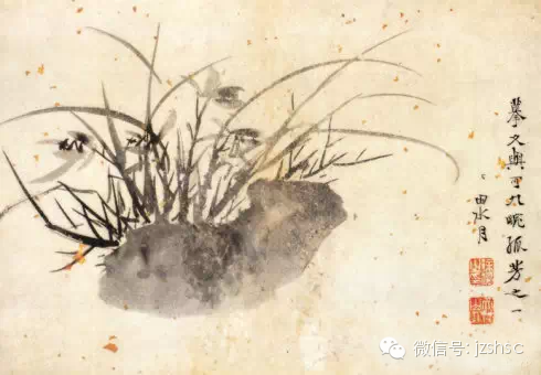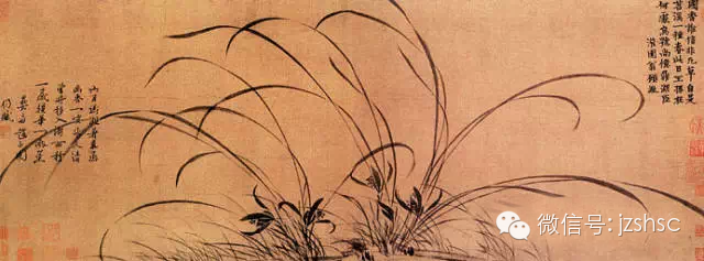 仅绘一束兰花。其姿态婀娜,充满生意。兰叶潇洒舒展,穿插有致,花瓣随意点簇,俏丽秀美。叶用重墨为之,花之墨色稍淡,均融入了书法的笔意。其笔势一波三折,有粗有细,有挺有转,有断有续,有收有纵。苍辣老健,变化多端。再加上墨气湿润淋漓,生动地表现了兰草的质感和风韵。