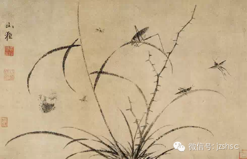 杜大成,金陵(南京人),《图绘宝鉴续编》作苏州人。工音律,善画花木禽虫,得嫣秀生动之趣,诚属写生妙手。此图寥寥几笔,似不经意,而花叶、草虫却生意盎然,栩栩如生。隔水上有清人陆售、潘景亦两跋。原附于杜堇《竹林高士图》卷中。