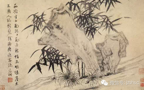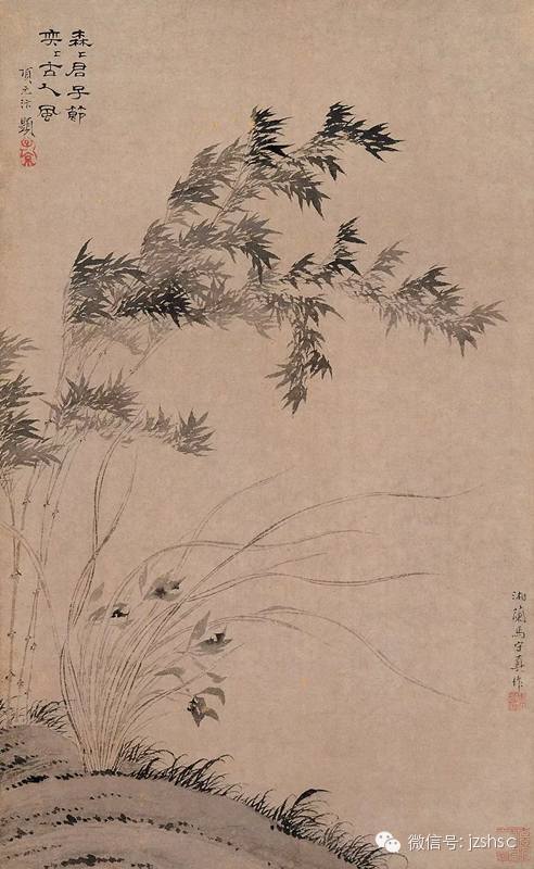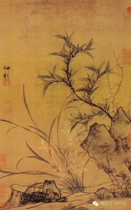 赵雍是元代著名画家赵孟畲巫, 当时有“吴兴公子(赵孟)冠当代,雍也继之早擅长”的诗句来赞誉他们父子俩。赵雍并不拘泥于家法,他不仅观察自然,心悟神会,得兰竹之形态,更能写出兰竹的神韵。此图右下角画一坡石,用墨线勾出轮廓,略施皴擦,染以淡墨,富于立体感。石间一枝翠竹,虬曲而上,似在风中摇动,用笔遒劲圆活,生意自足。竹石下面画一簇兰花,葳蕤有生气,用笔滋润淡雅,显出兰的柔韧婉顺的性格。