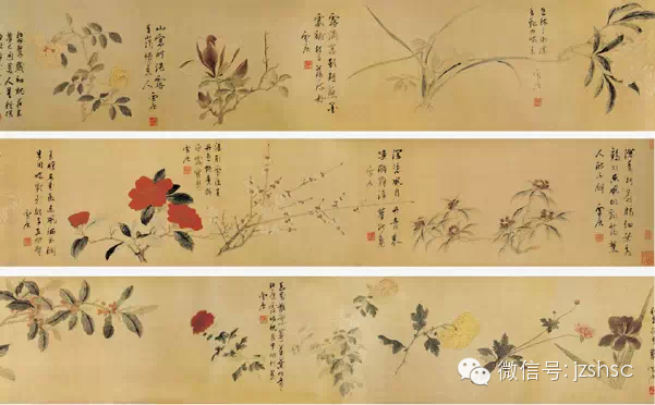 孙克弘(1533—1611),字允执,号雪居,华亭(今上海松江)人。擅画花卉,气格古雅。此图卷画折枝花卉十二段,自前向后依次为:紫丁香、白梅、大红宝珠山茶、白牡丹、畹兰、玉兰、月季、蝴蝶兰、菊、金粟、木兰、蝴蝶花。各段之间以画家自题诗句相间隔,并取得连贯一致的效果。十二种花卉,画家都能抓住其枝叶和花各自的自然特征描绘,有的素静清雅,有的热烈绚烂,但其姿态又无一不清细优雅,透现出了画家一定的心情品质。画中描法细秀柔婉,着色艳丽庄重,更使画面显得工整清丽,可以见出宋画的影响。