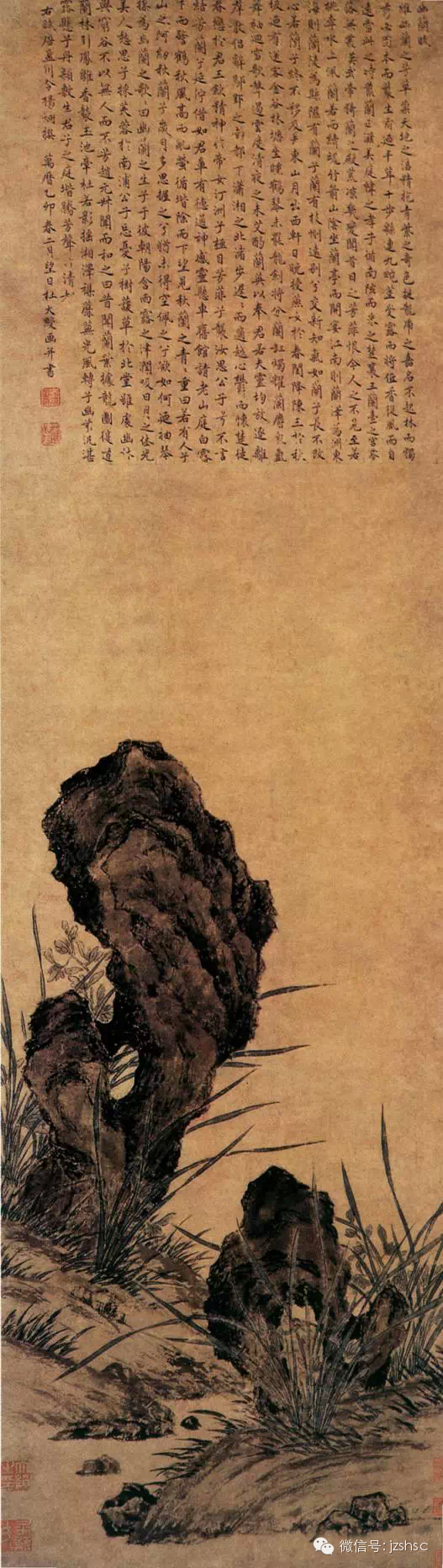 此画山石、兰竹多用行书的笔法,勾、擦、破、染大多中锋参以侧锋,工细中见尖峭。刻画精细,但在工细之中寓质朴,于沉着之中见灵动。笔墨则于干枯中见秀润,在熟练中见生涩,有很强的抒情意味。然构图密中有疏,山石勾勒少皴,多干笔而不见渲染,形成规整而略具装饰性,用笔尖细中带工拙,墨色干湿相间而总体清淡。这些画法都体现了文氏的自身特色,呈现出浓郁的文人书卷气,工秀中具清逸苍劲之韵的风格,也反映了他晚年的典型面貌。