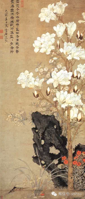 此图用双钩填色法画玉兰,兰花以湖石相衬托。笔致清秀,色彩淡雅。湖石用墨厚重,点染结合,浓重的玲珑湖石与轻盈的素白玉兰,对比强烈而又和谐,画风清丽。这幅作品属于画家细笔风格一路,整幅作品有典雅秀雅之态,颜色对比鲜明,富于节奏感,是能代表画家细笔花鸟画风的一幅作品。