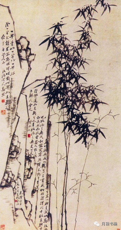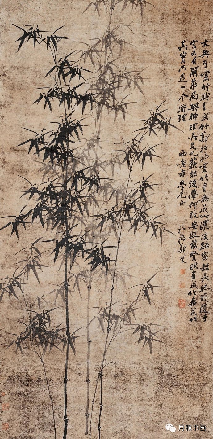他一生专注于画竹,格调超人,从而奠定了他在画竹史上别人无法企及的位置。图中书法也妙,熔黄庭坚、苏东坡于一炉,掺篆、隶、楷、行各种书体的杂糅,既有峻峭纵横之雄,又有潇洒秀丽之韵,人称“六分半书”。以兰竹笔画入书,以书法用笔入画。熔真草隶篆于一炉,结诗书画于一体,独树其帜,堪称“三绝”。