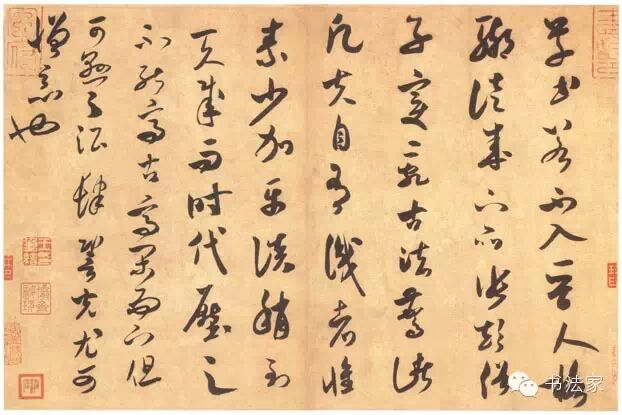 书法章法如拳击,手足要放得开,收得拢,立得稳重,起得轻捷,往复连环,离合相扣,才横去竖来,应接自如,立于不败。草书作品,从整体看,放开笔法,使它纵横得势,形在字里,气透纸外,可以说是开,开到将散,也就是说,放到不能再放,即将字的结尾处在一定程序上收回,折而向里,如翔龙回首,意在返顾,那气势就聚拢字中,不至散逸。假使有合无开,作品必拘谨少势,开而不合,又难免散漫,失去凝聚力。由此,也可看出,开合与呼应,看似不同,实则都由同一境界中生出,在行书、草书方面尤其如此。开合是作品的可视形象,呼应则是通过它所产生的一种心理效果。所以也可以说,呼应来源于开合,体现在顾盼。而线条之间的顾盼呼应,也正是作品的情所从来,意所由此,是体现作品内含的窗户,因而开合呼应,不仅是构图形式上的需要,而且是作品精神的基石之一。把握了开合呼应之道,也就把握了通向作品神情意态之门的钥匙。