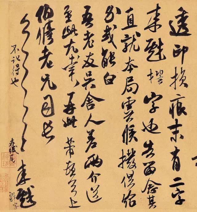 如同音乐的紧锣密鼓,通常是伴随乐章的高潮出现一样,书法线条的聚密之处,也常常就是作品的主体所在。有疏有密,见聚见散,作品便主次分明,藏露互见。只是要把握分寸,顺理成章,不可十分悬殊,否则不是勉强拥挤,就是零落散漫,密处不可雍塞,要小有漏透,极密处隙光一线,便是灵穴来风,可著通体生凉,又如人在深潭,一管透气,则吸咏裕如。所以“密叶间疏枝”,对书法一说,正是经验之谈。而疏散处亦不可全疏(对草书而言),“大疏间小密”,疏散之下,也要有某些比较集中的地方。这样就相互接引,彼此呼应。既有集中,又有变化。前人说“疏可跑马,密不容针”,那是极而言之,有点夸张,不可呆解。