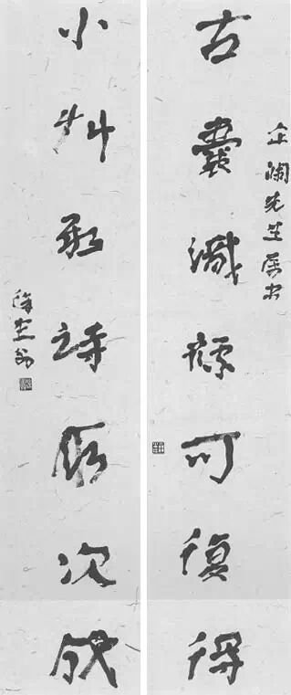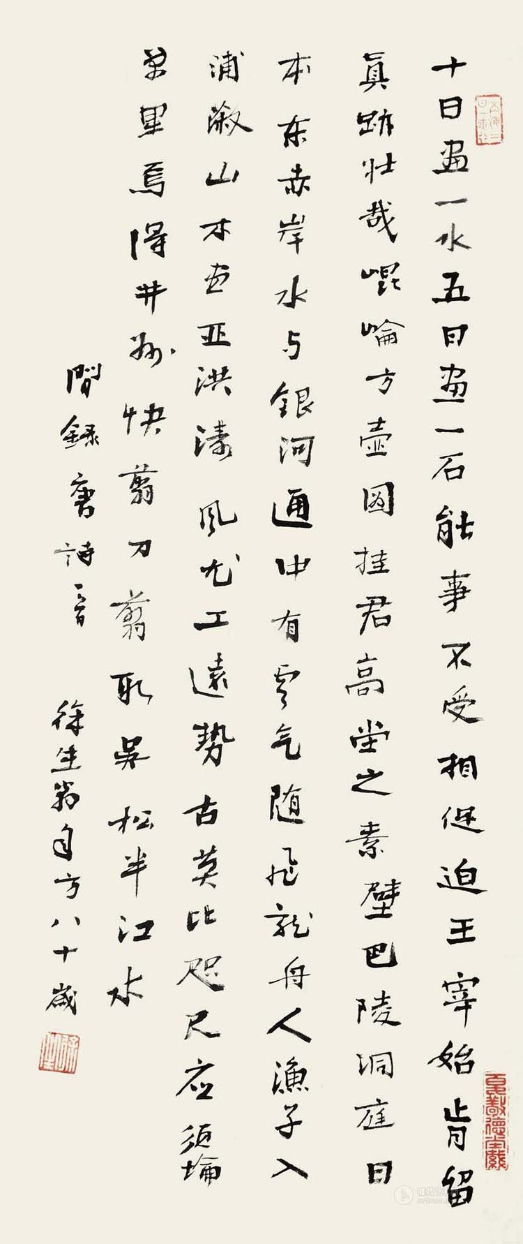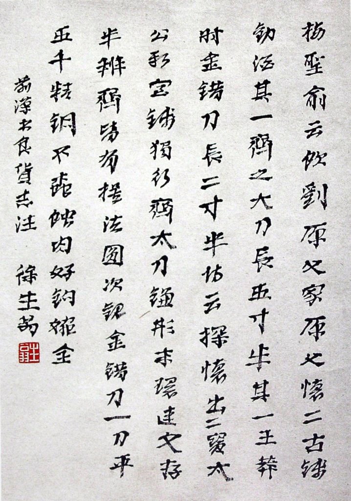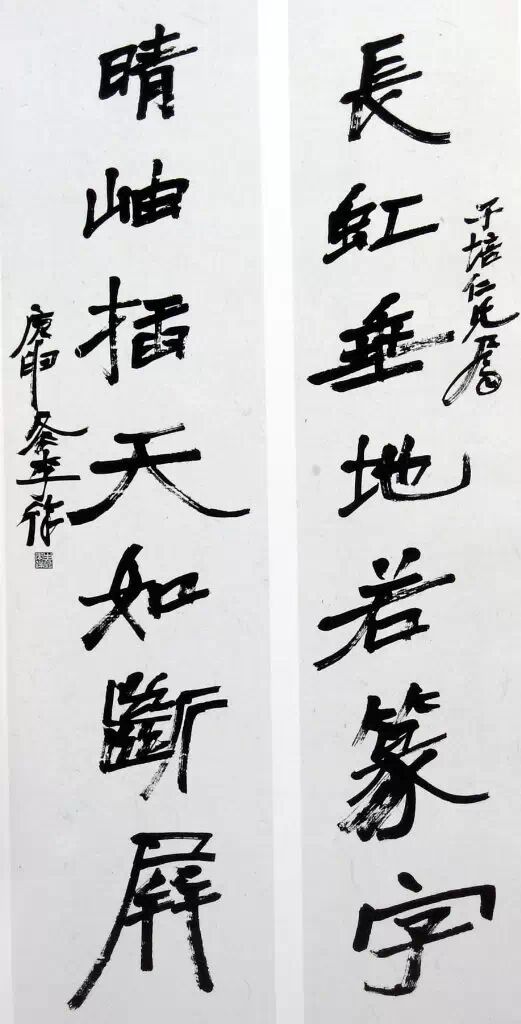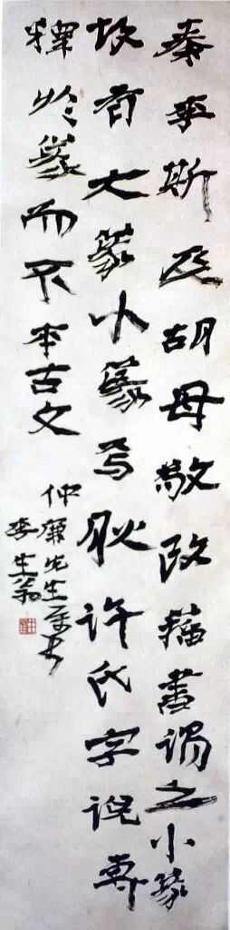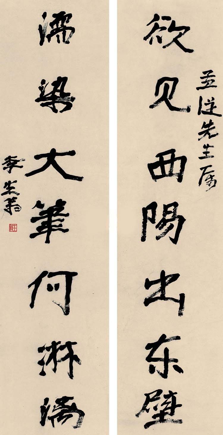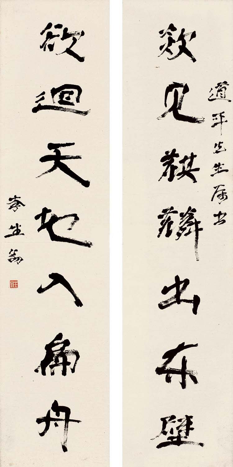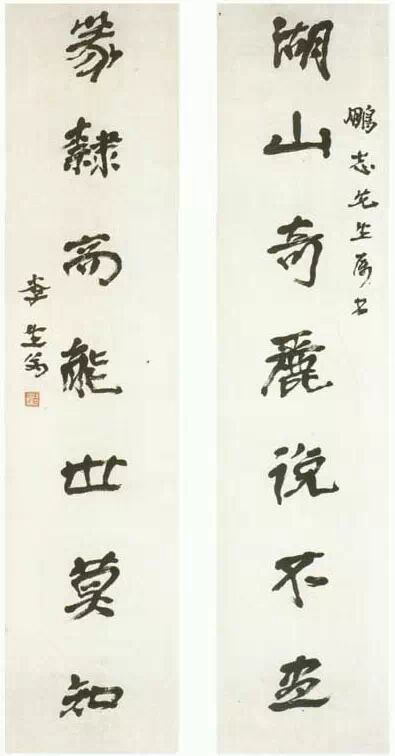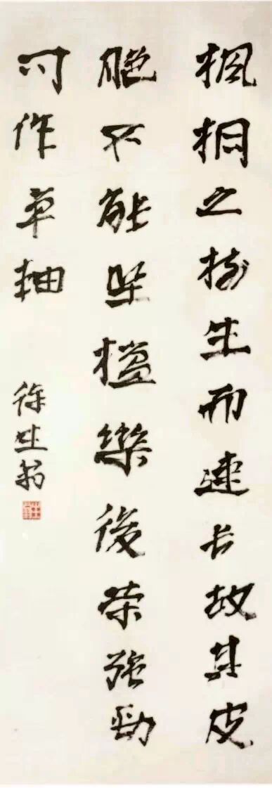 就书法而言,徐生翁初学颜真卿,后宗北碑,对秦汉周金和北魏六朝都悉心临摹,广收博取。诚如他自己所说:“余习隶书二十年,以隶意作真者又十余年,继嫌唐为法缚,乃习篆以窥魏、晋,而魏、晋古茂终逊汉人,遂沿两汉吉金,上攀彝鼎。”从他的小幅扇面作品中,似乎还可以看出他学颜真卿的痕迹,而他的大部分作品,则都是字结体奇崛、生拙古辣,由北碑出,又不受北碑的制约,全然一派独往独来的狂放形象。有时看上去好像完全放弃了用笔,不讲究笔法,但别具情趣。有人称道他的小幅作品,这是因为一些小幅作品他还注意通常意义上的审美习惯,而大部分创作,则不受任何约束。他写字,只是为了写字。为了心灵的需要,而没有写字以外的目的:用不着取悦别人,用不着迎合市场,用不着追逐时风。他几乎把自己封闭起来,不和外界接触。这种纯粹的艺术状态,至为难得。他的字长期不为人称道,但的确是格调高古。更为可贵的是,他的书法体现了一种强烈的风格面貌,具有极强的创新精神。特别是其晚年的书法,铅华洗尽,古朴稚拙,天真自然,达到了炉火纯青,随心所欲的高妙境界。