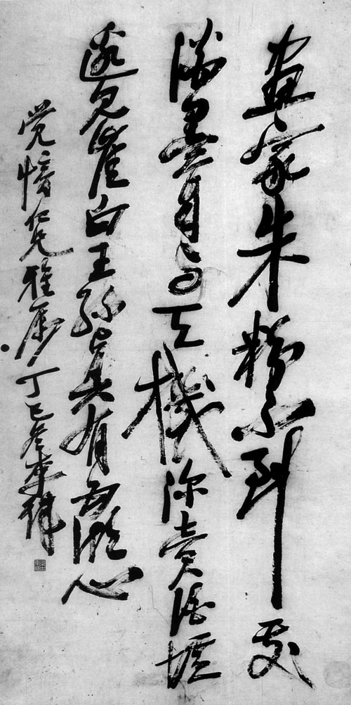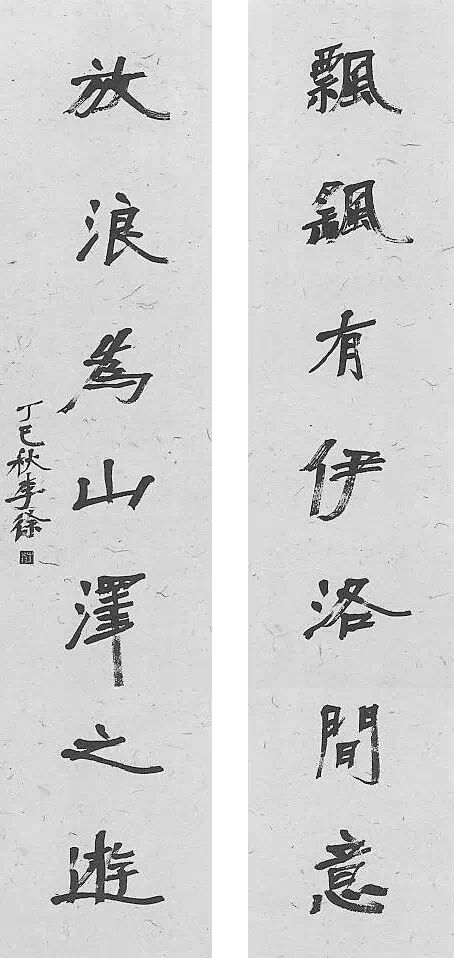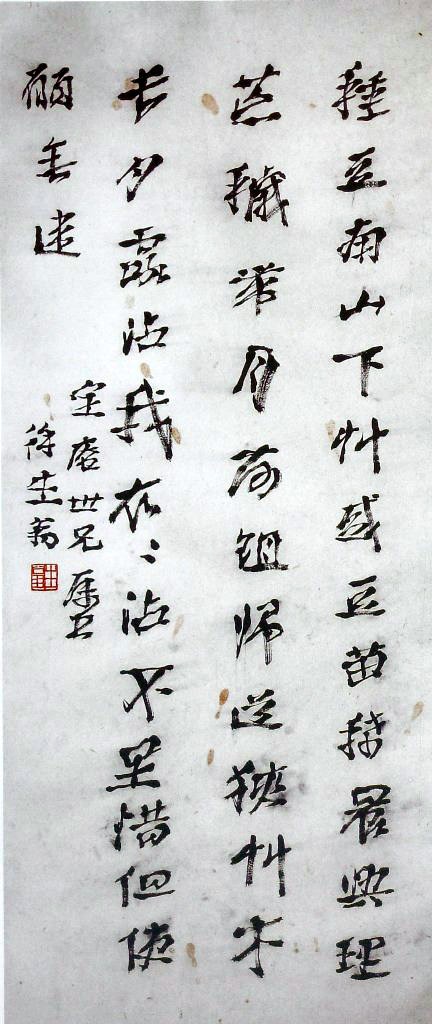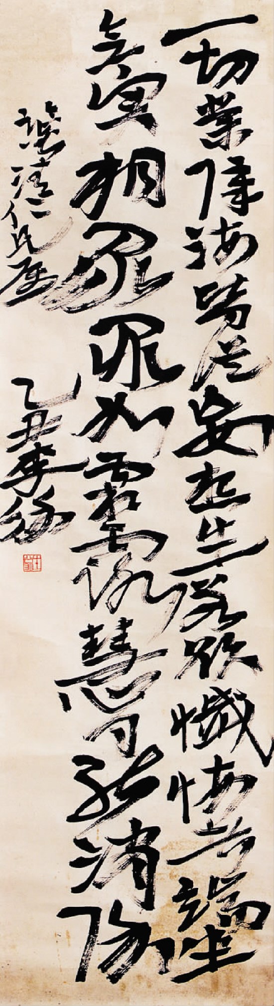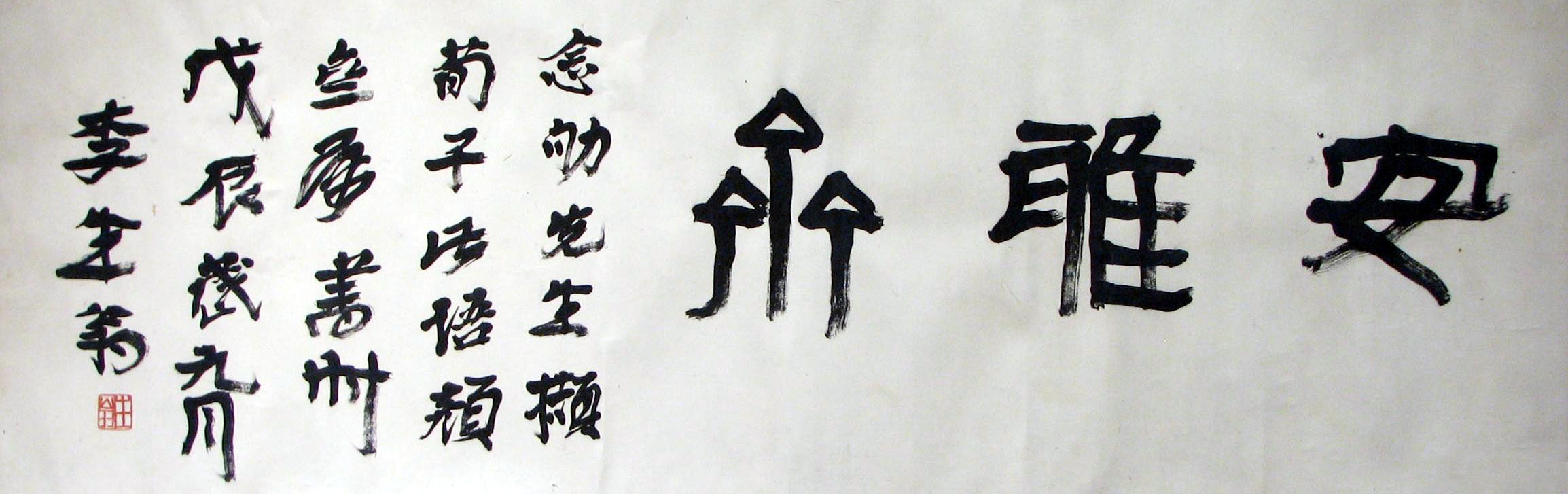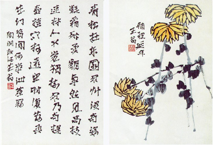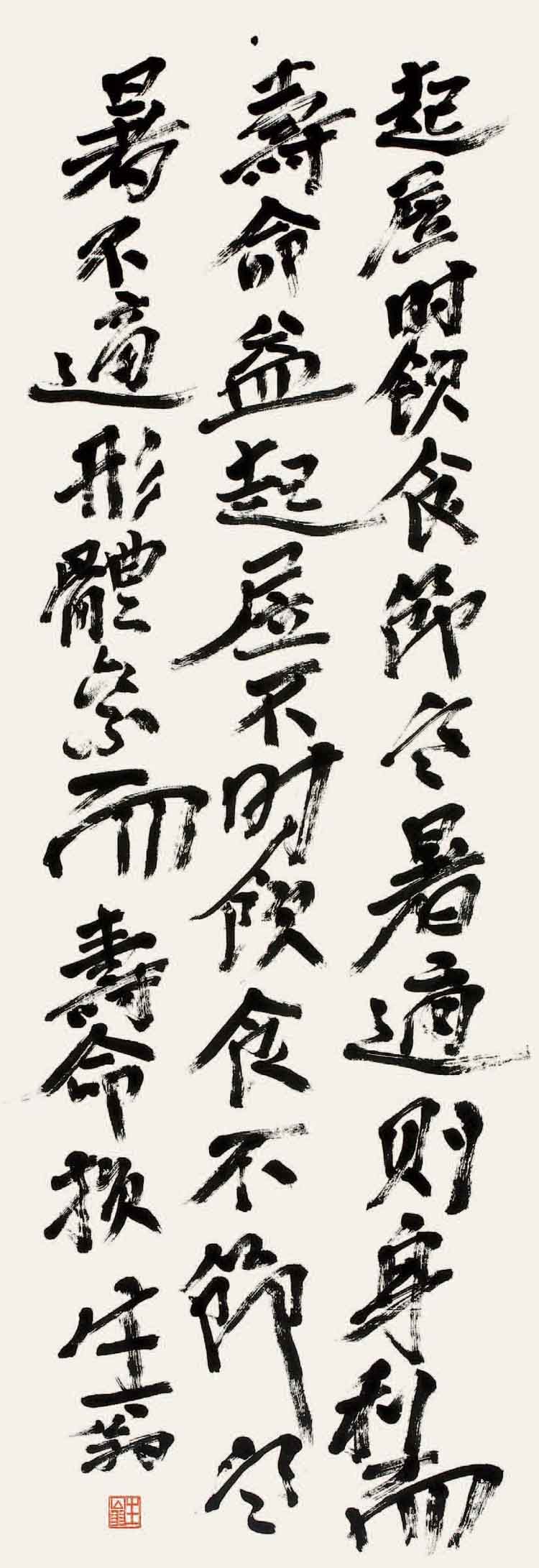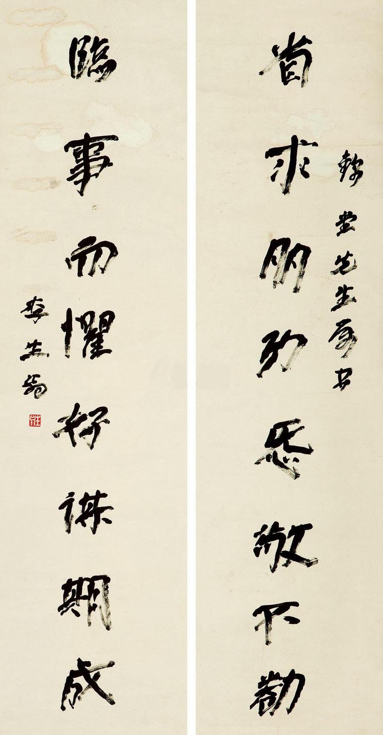 就书法而言,徐生翁初学颜真卿,后宗北碑,对秦汉周金和北魏六朝都悉心临摹,广收博取。诚如他自己所说:“余习隶书二十年,以隶意作真者又十余年,继嫌唐为法缚,乃习篆以窥魏、晋,而魏、晋古茂终逊汉人,遂沿两汉吉金,上攀彝鼎。”从他的小幅扇面作品中,似乎还可以看出他学颜真卿的痕迹,而他的大部分作品,则都是字结体奇崛、生拙古辣,由北碑出,又不受北碑的制约,全然一派独往独来的狂放形象。有时看上去好像完全放弃了用笔,不讲究笔法,但别具情趣。有人称道他的小幅作品,这是因为一些小幅作品他还注意通常意义上的审美习惯,而大部分创作,则不受任何约束。他写字,只是为了写字。为了心灵的需要,而没有写字以外的目的:用不着取悦别人,用不着迎合市场,用不着追逐时风。他几乎把自己封闭起来,不和外界接触。这种纯粹的艺术状态,至为难得。他的字长期不为人称道,但的确是格调高古。更为可贵的是,他的书法体现了一种强烈的风格面貌,具有极强的创新精神。特别是其晚年的书法,铅华洗尽,古朴稚拙,天真自然,达到了炉火纯青,随心所欲的高妙境界。