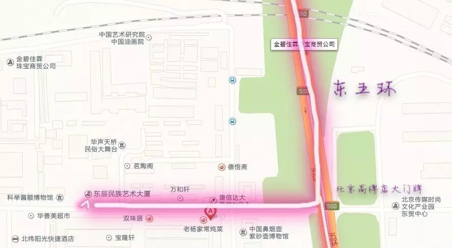 您可以从广渠路出发行车至广渠路高架桥(大郊亭桥向东直行)直行接近东五环,即看左侧近润坤大厦出口出,沿唯一的小路行驶(也可导航华膳园国际温泉)路过华膳园温泉直行100米后路西即到高碑店民俗文化街,进入文化街向西直行200米即到东辰民族艺术大厦。