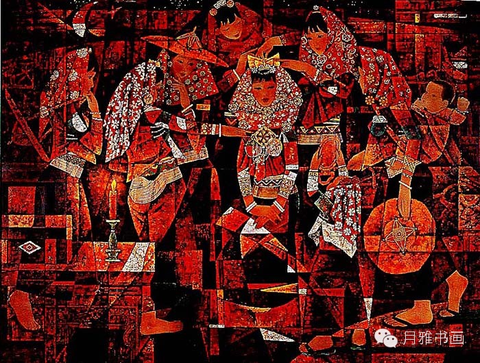 唯一一件民族题材作品——韦尔申的《吉祥蒙古》。作者将人物形态和蒙式装束的外观及衣纹,经过高度概括、提炼处理为棱角分明的平面和直线,画面背景构思成带有肌理的、厚重的橘棕色平面,在3个蒙族妇女的头部周围留有一些浅橘色光晕,增强了画面郑重、神秘、神圣的气氛。