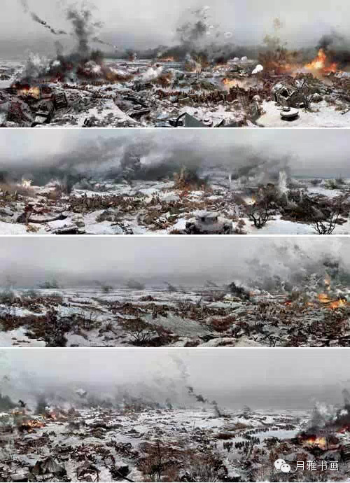 由李福来、晏阳、李武、曹庆堂、周福先、韦尔申、付巍巍、李宪吾、孙兵、刘希倬等10位来自鲁迅美术学院专业画家共同完成的《淮海战役》,艺术家们运用全景画所特有的造型手段,将一个个有重大影响的历史瞬间,凝固在150多米长、18米高的画布上。