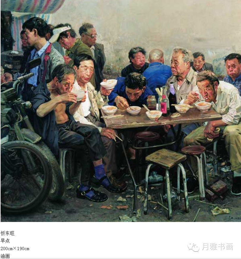 贴近生活、来自基层,有关农民的,往往更能够引起观众的共鸣。比如,王宏剑的《阳关三叠》,刻画了民工潮的一个场景,三分之二的天,晨月高悬,极其空廓;三分之一的密集的人群按平远推开。大疏大密,黑白分明。忻东旺的《早点》,是他在天津每天路过的早点铺感受到的题材,画家赋予了生活在社会底层的人们以强烈的人文关怀。