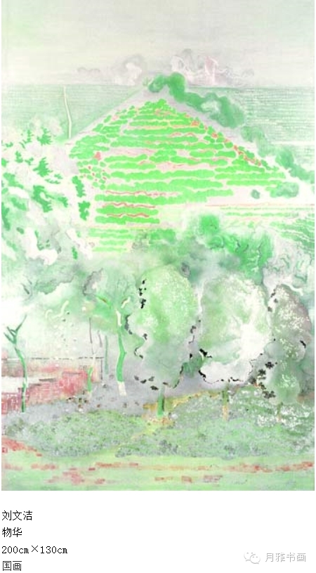 另一位女性画家刘文洁的《物华》,作品的颜料选择丙烯,是对中国画一直以墨和矿物原料的一种挑战。将西画中的造型特征融入画面的同时,不但没有伤害画面,反而烘托了水墨画的新的意境,在当时来说备受争议,但专家们还是给予了高度评价。