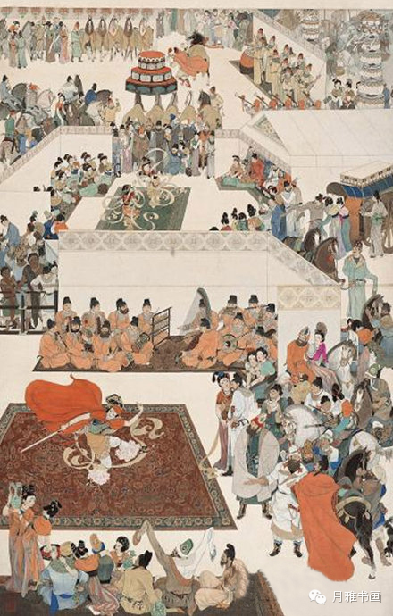 国画金奖中唯一一件历史题材,就是谢振瓯的代表作——《大唐伎乐图》,再现了盛唐宫廷演出的奢华和繁复。在这之前,历史画少有人问津。谢振瓯在艺术语言上弱化了线的表现力,多种技法的综合性运用增强了色彩、气氛、光感的效果;受西方现代艺术的影响,呈现出了大节奏、大块面的构成趣味;在颜料的绘涂中拓展了重彩的表现力。