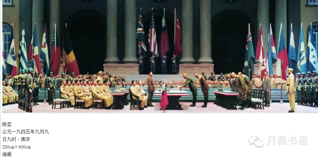 陈坚的《公元一九四五年九月九日九时·南京》,整个画面庄重肃穆,反映抗日战争胜利后,日本递交投降书的庄严场面,近似于真人大小的200多个人物,作者花费10年心力创作,作品达到了思想性、艺术性、观赏性的统一。