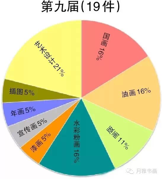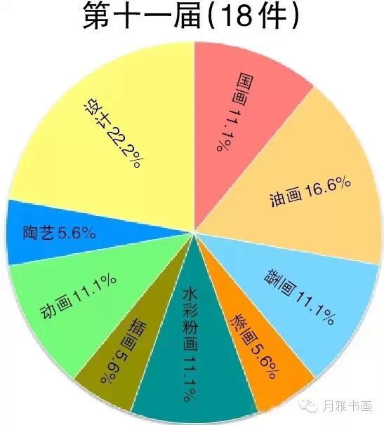 第十一届产生18件金奖作品,国画2件(11.1%)、油画3件(16.6%)、壁画2件(11.1%)、漆画1件(5.6%)、水彩粉画2件(11.1%)、插图1件(5.6%)、设计4件(22.2%)、动画2件(11.1%)、陶艺1件(5.6%)。