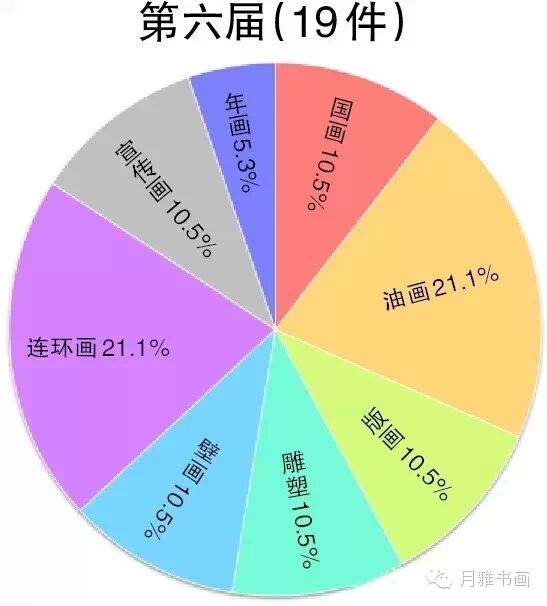 第六届共产生19件金奖作品,其中 国画2件(10.5%)、油画4件(21.1%)、版画2件(10.5%)、雕塑2件(10.5%)、壁画2件(10.5%)、连环画4件(21.1%)、宣传画2件(10.5%)、年画1件(5.3%)。第六届全国美展中,金奖作品的分配较为集中,其中最热门的当属油画和连环画,联合占据这届金奖的半壁江山。