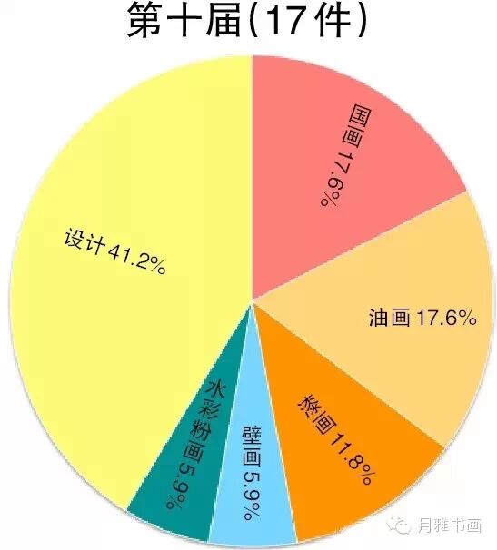 第十届产生17件金奖作品,国画3件(17.6%)、油画3件(17.6%)、漆画2件(11.8%)、壁画1件(5.9%)、水彩粉画1件(5.9%)、设计7件(41.2%)。第十届全国美展中,重新恢复了壁画的评奖,同时增设了陶艺和招贴画(在本届中无产生金奖)。设计占据主导地位,夺得三分之一的金奖;版画、雕塑逐步走下坡路,连、年、宣、漫、插也渐渐淡出人们的视野,这些画种均未产生金奖作品。