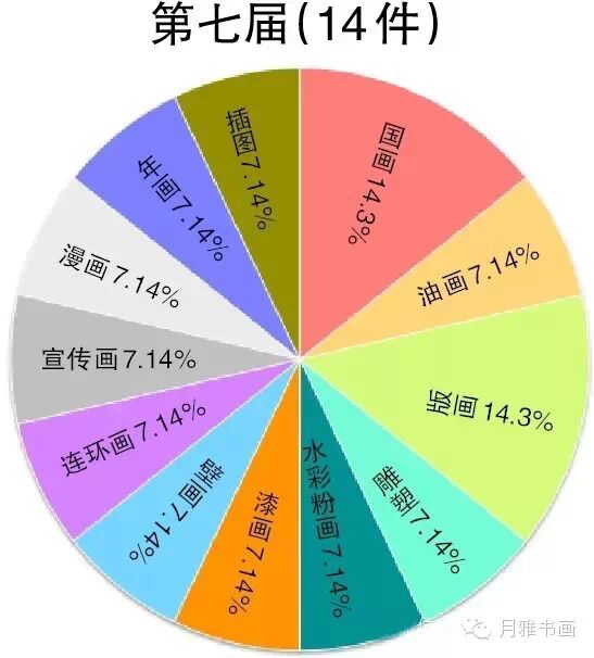 七届产生14件金奖作品,国画2件(14.3%)、油画1件(7.14%)、版画2件(14.3%)、雕塑1件(7.14%)、水彩粉画1件(7.14%)、漆画1件(7.14%)、壁画1件(7.14%)、连环画1件(7.14%)、宣传画1件(7.14%)、漫画1件(7.14%)、年画1件(7.14%)、插图1件(7.14%)。第七届全国美展金奖作品的画种分布较为均衡,各画种兼顾到,均有1—2件金奖产生。